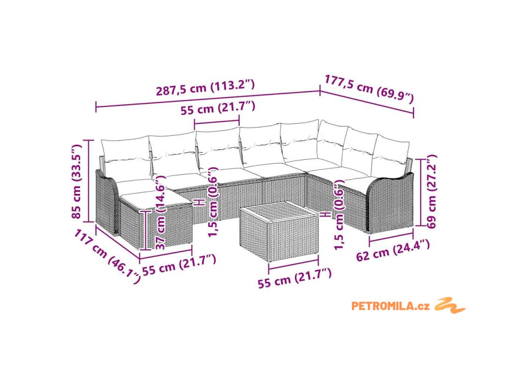 - Součásti Sada obsahuje rohovou sedačku, středové sedačky, arm sofa, podnožku a zahradní stůl, každý kousek má poly ratanový zadní panel a polštáře s polyesterovou výplní a odnímatelnými potahy.