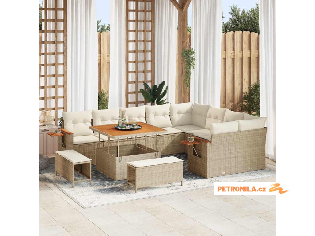 - Součásti: Obsahuje pohodlné opěráky a područky z poly ratanu, ideální pro lenošení. Pevný akáciový povrch dodává eleganci a teplo. Voděodolné venkovní polštáře to skvěle doplňují.