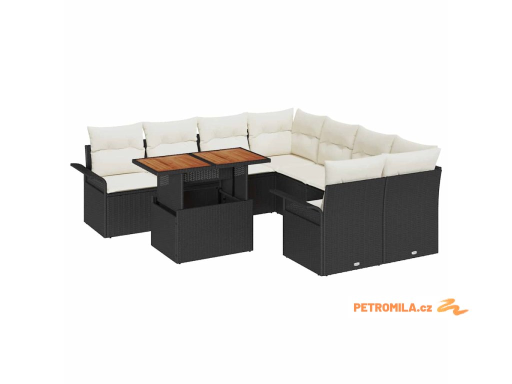 Tkaná textura: Užijte si eleganci a kouzlo tkaného polyratanu, který dodává charakter každému venkovnímu prostředí. Důmyslný tkaný vzor nejen zvyšuje vizuální přitažlivost, ale také přispívá k pohodlí a relaxaci nabízené touto zahradní sedací soupravou.,Odolné komponenty proti počasí: Navrženo pro dlouhověkost venku, tato sada je vyrobena z UV-odolného polyratanu a práškově lakované oceli, což zajišťuje, že odolává tvrdému slunečnímu záření a různým povětrnostním podmínkám a přináší klid na duši pro dlouhodobé používání.,Funkční design: S odnímatelnými a vyměnitelnými polštáři tato sada nabízí praktickou funkčnost. Společně s integrovanými možnostmi skladování v každém kusu zajišťuje, že budete udržovat uklizený a organizovaný venkovní prostor.,Aestetická univerzálnost: Její moderní design s zakřivenými opěrkami rukou a povrchem z hnědé akácie se pohodlně snoubí s různými styly. Ať už v zahradě nebo na terase, povyšuje prostředí prostřednictvím svých přizpůsobivých vzhledů.,Péče a údržba: Mějte klid, protože péče je jednoduchá. Otřete vlhkým hadříkem nebo použijte obal, když není používán, abyste zachovali jeho stav, zajišťující, že váš nábytek vždy vypadá jako nový. Pohodlné pokyny pro péči činí údržbu snadnou i pro zaneprázdněný životní styl.- Barva: Černá a krémová