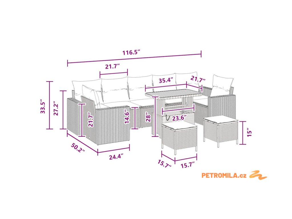 - Zahrnuté komponenty: Můžete se těšit na čtyři arm-sedáky, tři středové sedačky a dvě čtvercové stoličky, všechny s úložnými prostory. A nesmíme zapomenout na odpovídající stůl pro kompletní sestavu. Úložné prostory jsou vodotěsné, praktické a nikterak to neubírá na stylu.