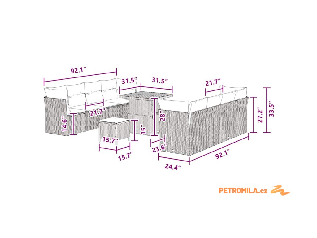 - Součásti: Souprava obsahuje čtyři rohové sedáky a čtyři středové sedáky, všechny mají praktické úložné prostory, které zvyšují funkčnost a neztrácejí styl. Dvě čtvercové stoličky a stylový stůl dělají balíček kompletní, abyste měli všechno potřebné pro pohodový relax venku.