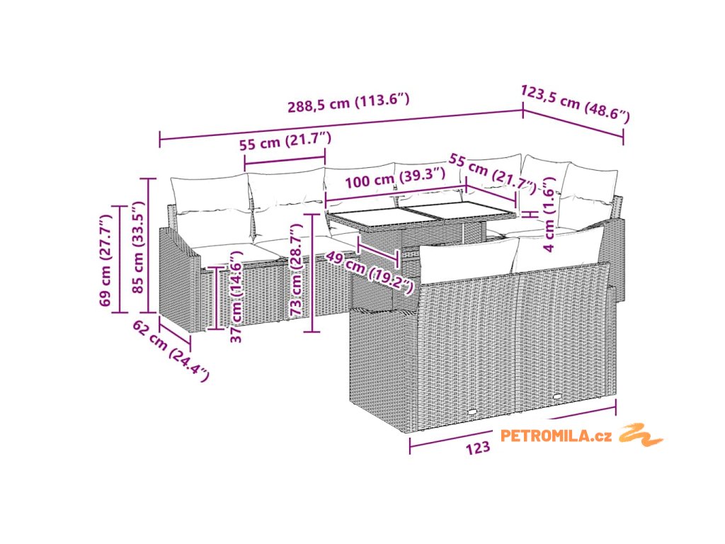 - Celkové rozměry: 288,5 x 123,5 x 85 cm (D x Š x V)