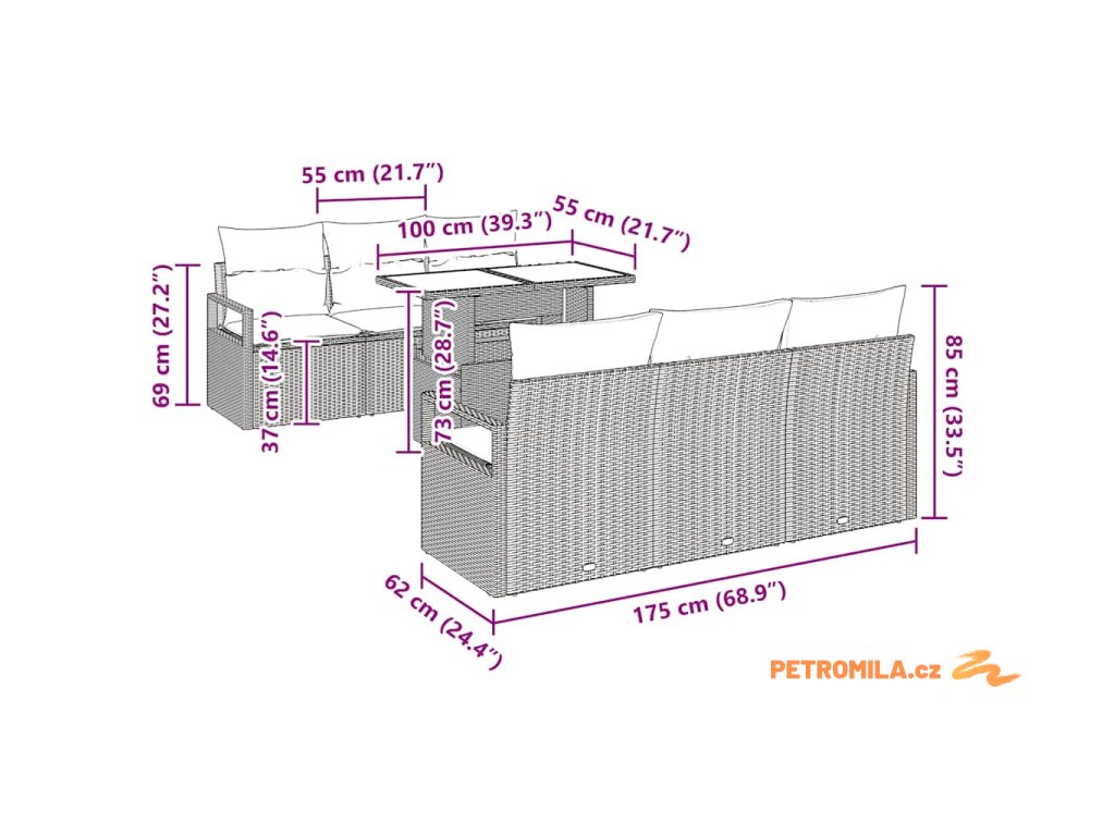 - 4 x armrestová sedačka: 60 x 62 x 69 cm (D x Š x V)