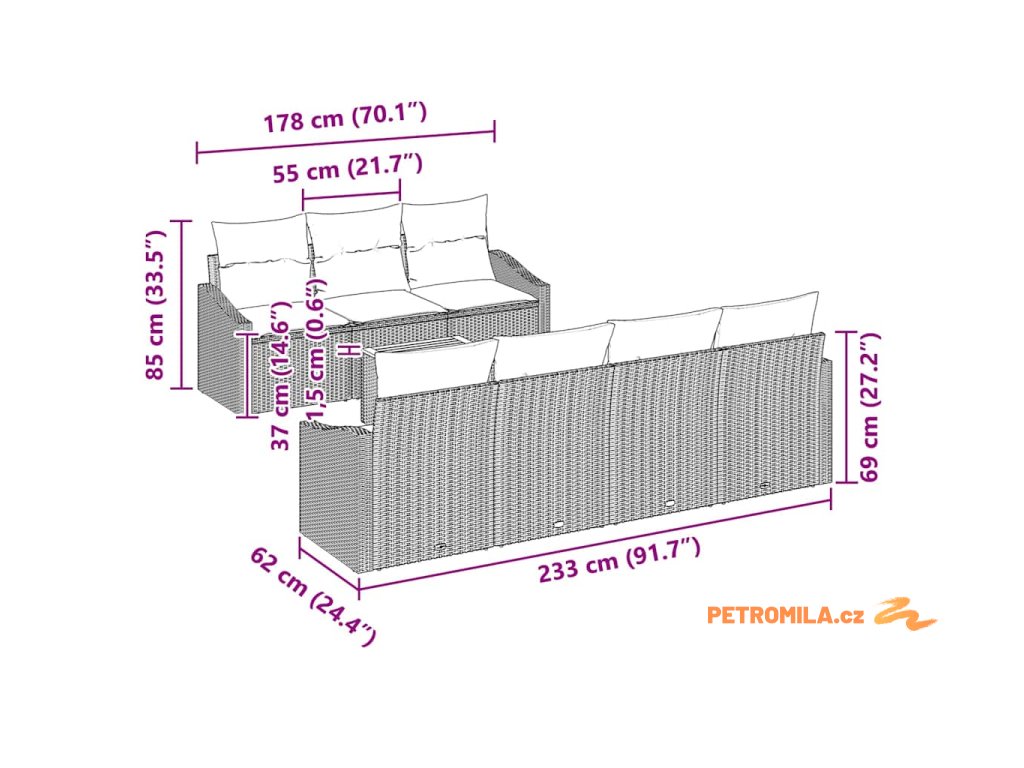 - 4 x pohovka s područkami: 61,5 x 62 x 69 cm (D x Š x V)