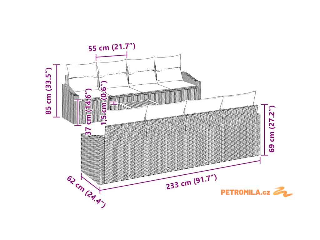 - 4 x středové sedadlo: 55 x 62 x 69 cm (D x Š x V)