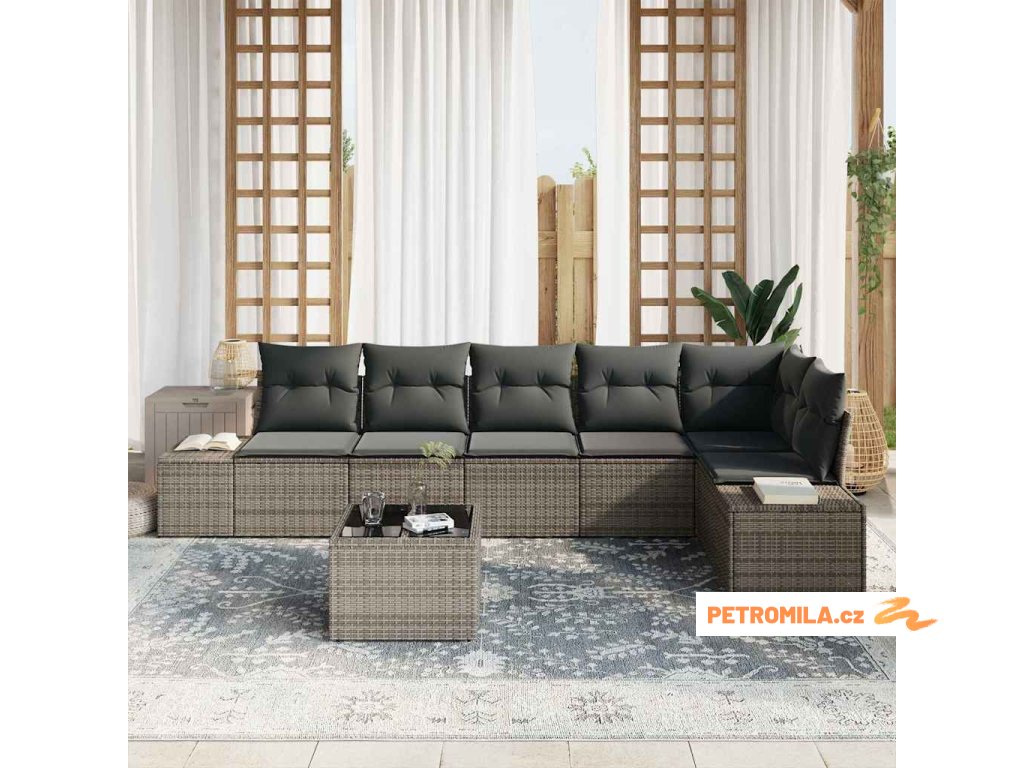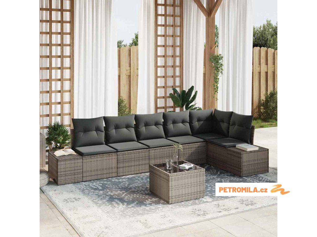 7dílný zahradní jídelní set s poduškami světle šedý polyratan