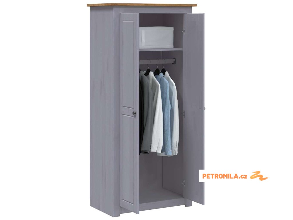 Textilní skříň má pevnou polici pro uložení a uspořádání bot, svetrů, džínů, klobouků, kabelek atd. Velká přihrádka je vybavená tyčí na ramínka, takže ji můžete použít k zavěšení kabátů, šatů apod. Šatní skříň je vyrobená z masivního borového dřeva, je tedy robustní a zaručuje dlouhodobé používání.