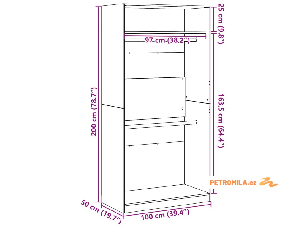 - Celkové rozměry: 100 x 50 x 200 cm (D x Š x V)