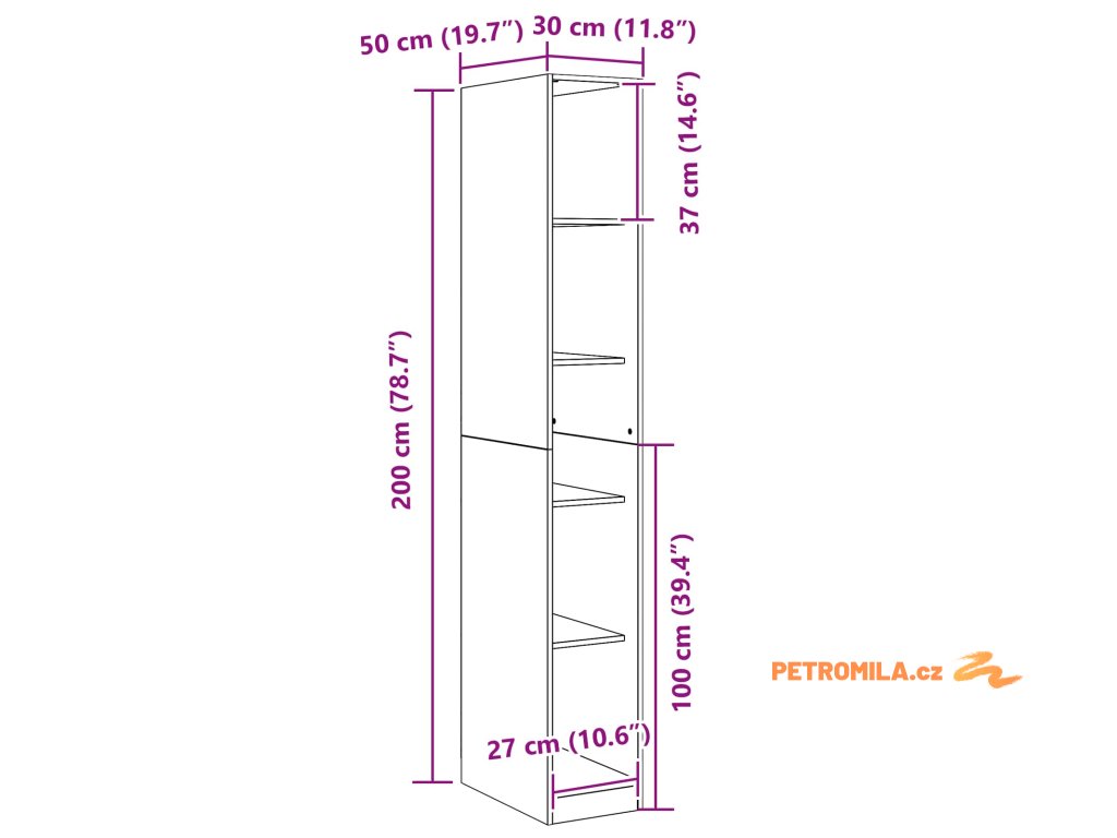 - Celkové rozměry: 30 x 50 x 200 cm (D x Š x V)