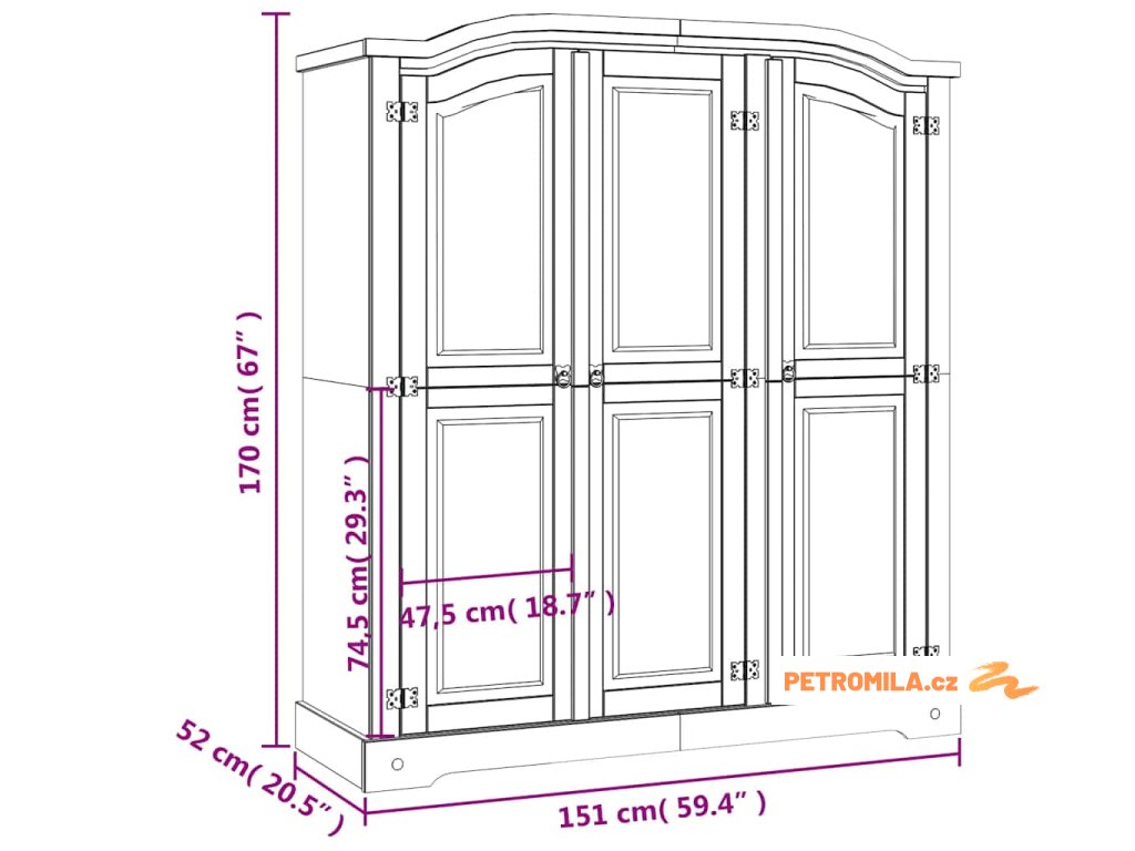 Šatní skříň má krásný klenutý design horní části a 3křídlé dveře. Pevná a bytelná skříň je zhotovená z masivního borového dřeva. V prostorné levé části je horní police a tyč na ramínka pro snadnou organizaci vašeho oblečení. V pravé části skříně jsou čtyři police, které jsou ideální pro vaše spodní prádlo, ponožky apod.