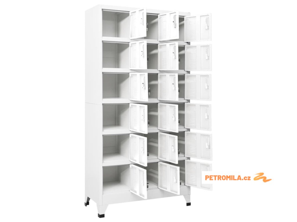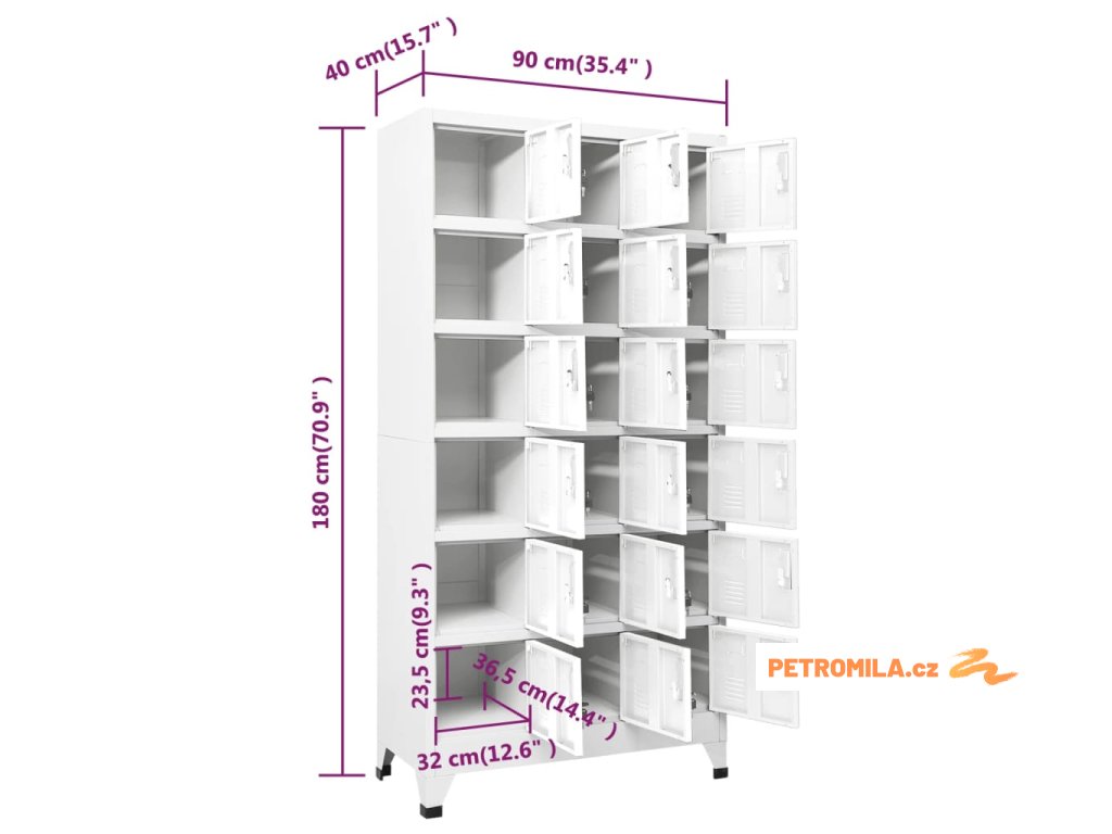 S 18 přihrádkami s uzamykatelnými dvířky má tato skříňka dostatek úložného prostoru pro uložení oblečení a dalších věcí. Každá dvířka jsou vybavena držákem na jmenovku a větracími otvory. Šatní skříňka je vyrobena z plechu, takže je odolná a snadno se čistí. Sestavení je snadné.