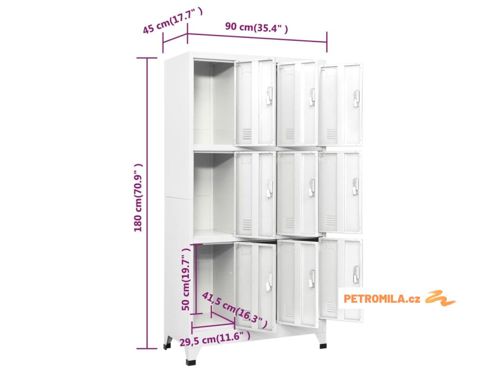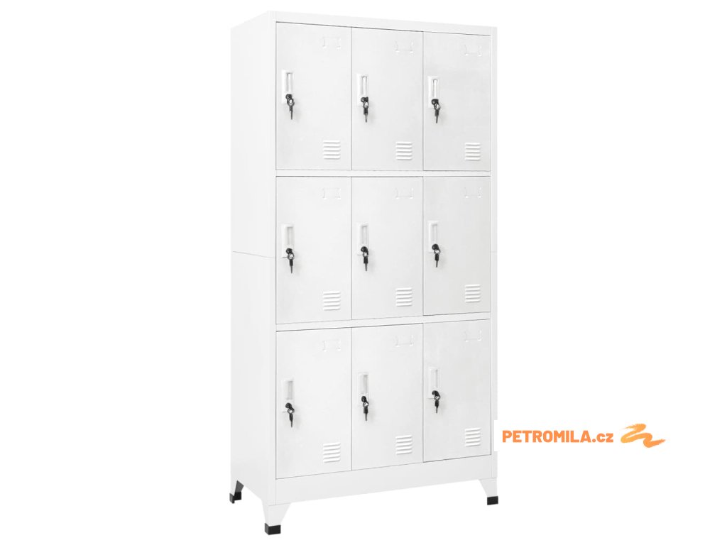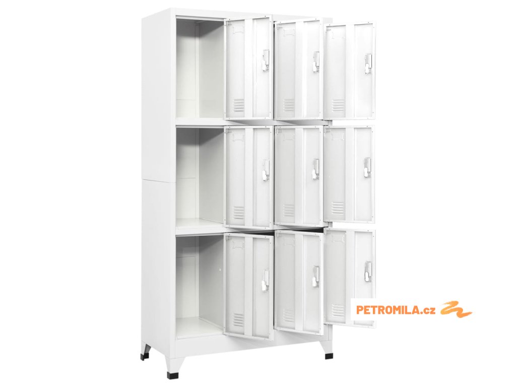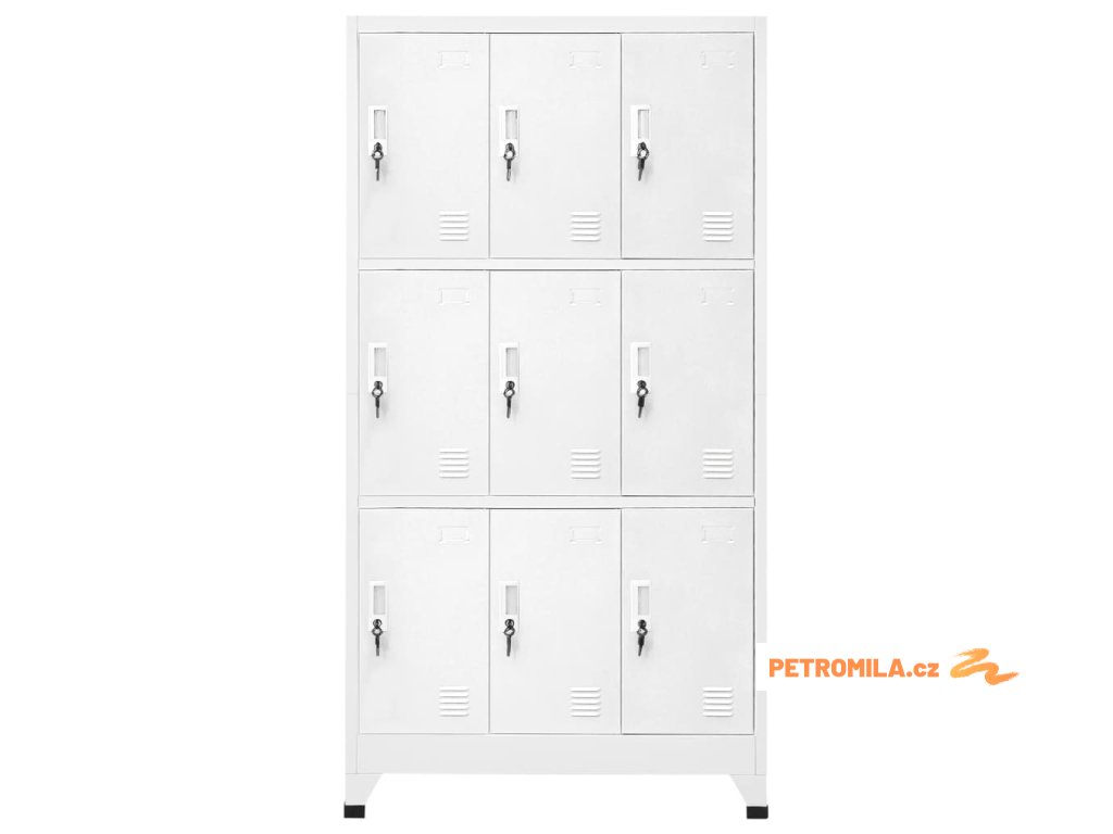 S 9 oddělenými přihrádkami s uzamykatelnými dveřmi má tato skříňka dostatek úložného prostoru pro uložení oblečení a dalších věcí. Každá přihrádka je vybavena držákem na jmenovku. Plastové nožičky zabraňují poškrábání podlahy.