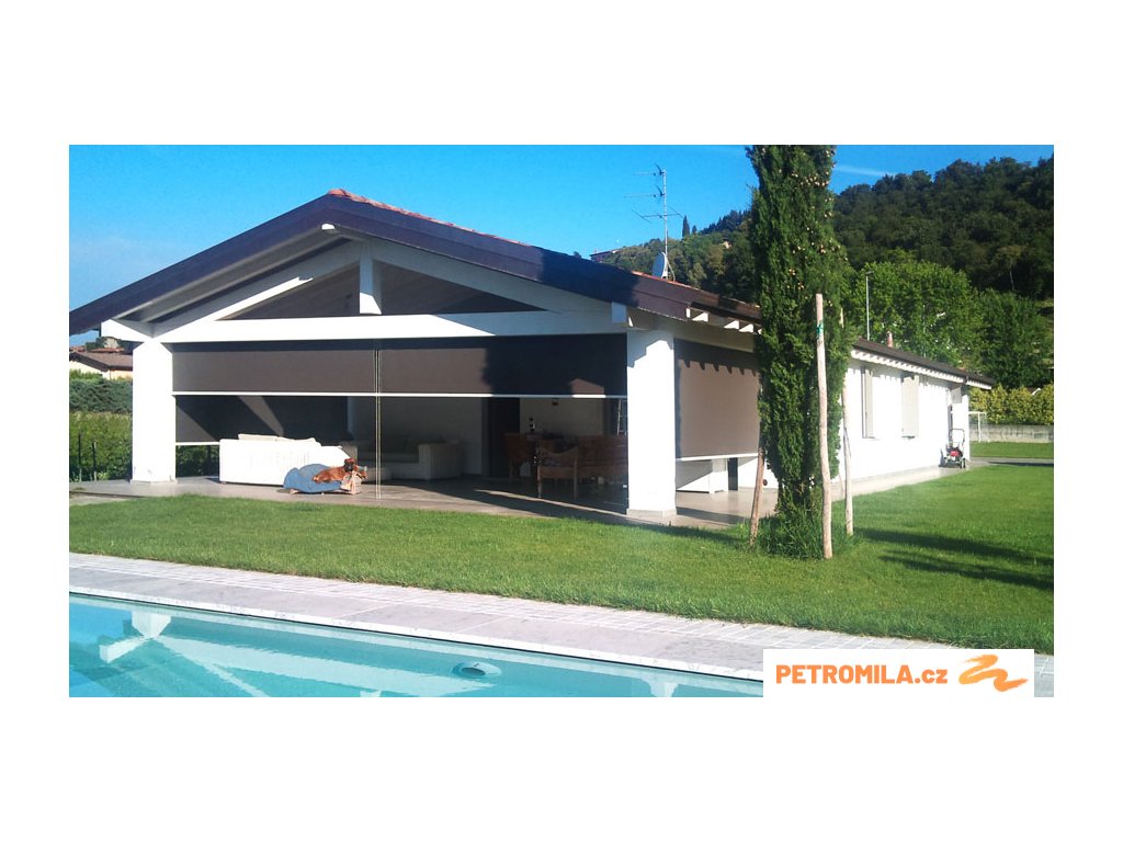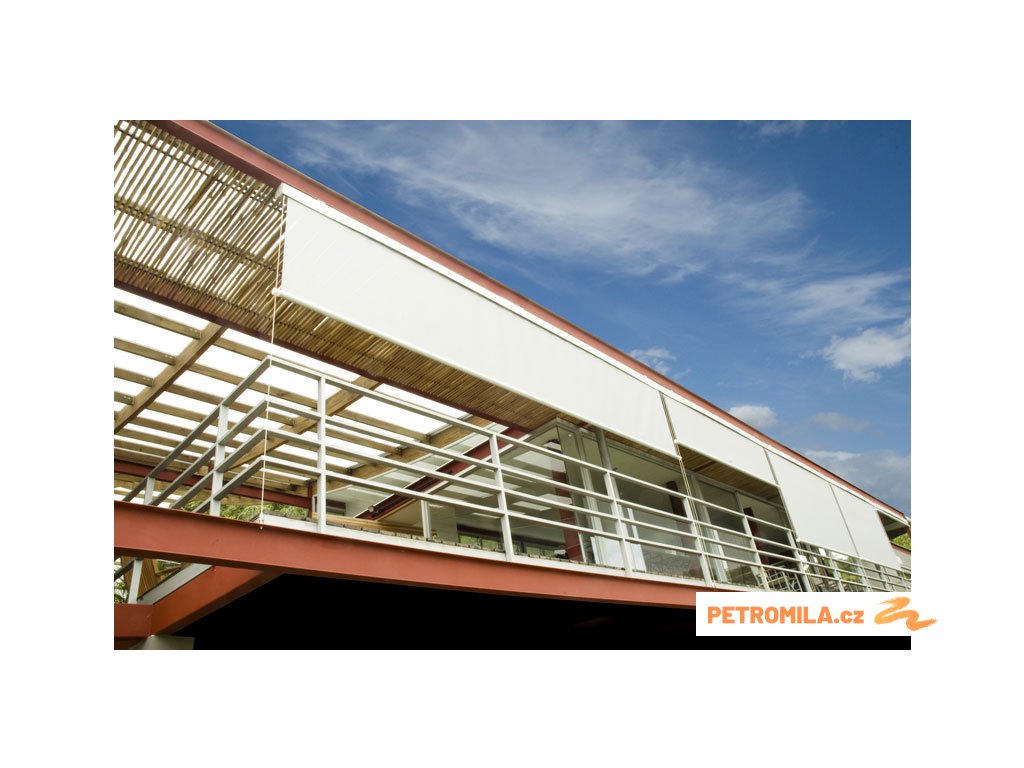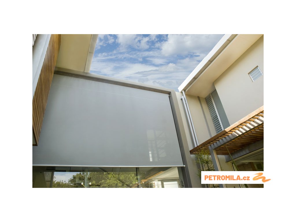 Screenová roleta GW s krycím boxem pro terasy, pergoly, větší interiérové i exteriérové plochy, výroba na míru, možnost montáže na strop nebo na zeď.