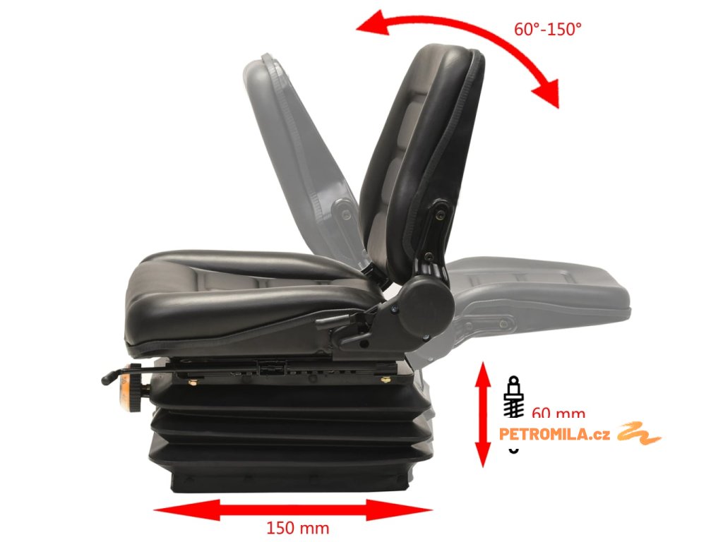 Traktorová sedačka je navržená s nosností 50 až 130 kg. Tuto hodnotu si můžete nastavit páčkou na základně sedadla. Disponuje silným odpružením, které pomáhá tlumit vliv nerovného terénu a umožní vám tu nejpohodlnější jízdu traktorem nebo zdvižkou, jakou si dovedete představit. Tato sedačka je rovněž vybavená posuvnými drážkami, aby ji bylo možné posouvat dopředu a dozadu v rozsahu 150 mm. Opěradlo je možné nastavit do jakéhokoli úhlu sklonu mezi 60° a 150°, takže si můžete vždy najít pozici, která je vám nejpohodlnější. Montáž je velmi snadná.