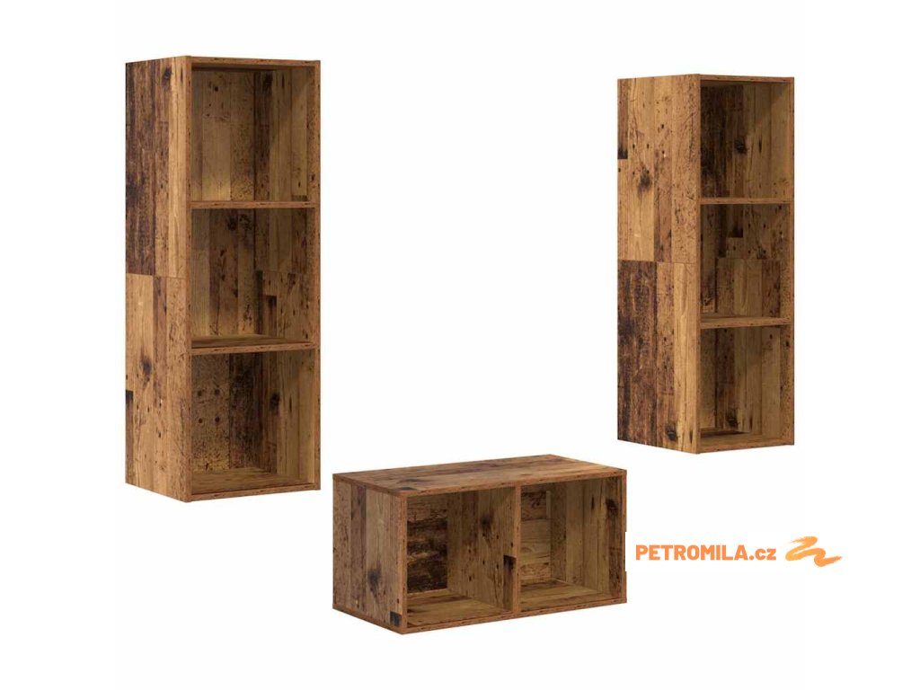 Složení z kompozitního dřeva Tato skříňka je vyrobena z odolného kompozitního dřeva, známého svou pevností a odolností vůči opotřebení. Materiál dodává sofistikovaný vzhled, přičemž je lehký, což z něj činí skvělou volbu pro nástěnný nábytek. Jeho robustnost zajišťuje, že skříňka zůstane stabilním a trvanlivým kusem v jakémkoli domácím prostředí.,Více možností úložného prostoru S kombinací velkých a malých nástěnných skříněk nabízí tato sada dostatek úložného prostoru pro mediální zařízení, knihy a dekorativní předměty. Promyšlený design umožňuje organizované ukládání, což pomáhá udržet váš obytný prostor uklizený a bez nepořádku, zatímco elegantně vystavuje vaše věci.,Moderní designový styl Důraz na jednoduchost a praktičnost dělá čisté linie a skromnou výzdobu sady moderní estetikou, která se skvěle hodí k různým stylům domu. Tato rovnováha formy a funkce z ní činí univerzální volbu, ať už se soustředíte na minimalistické interiéry, nebo chcete přidat moderní dotek do klasicky zařízené místnosti.,Pohodlné nástěnné umístění Systém montáže na stěnu nejen optimalizuje prostor, ale také poskytuje jedinečný plovoucí efekt. Zvedá skříňky nad podlahu, což usnadňuje přístup a zjednodušuje úklid pod nimi. Minimalistické montování je ideální pro ty, kdo preferují úhledné a sofistikované domácí prostředí.,Praktická údržba Péče je snadná s jednoduchými metodami údržby. Rychlé otření vlhkým hadříkem je dostatečné, aby skříňka vypadala bezchybně a zachovala si texturovaný povrch. Tato vlastnost zajišťuje dlouhotrvající eleganci a pohodlí, což z ní činí ideální volbu do každého obývacího pokoje.- Barva: Staré dřevo
