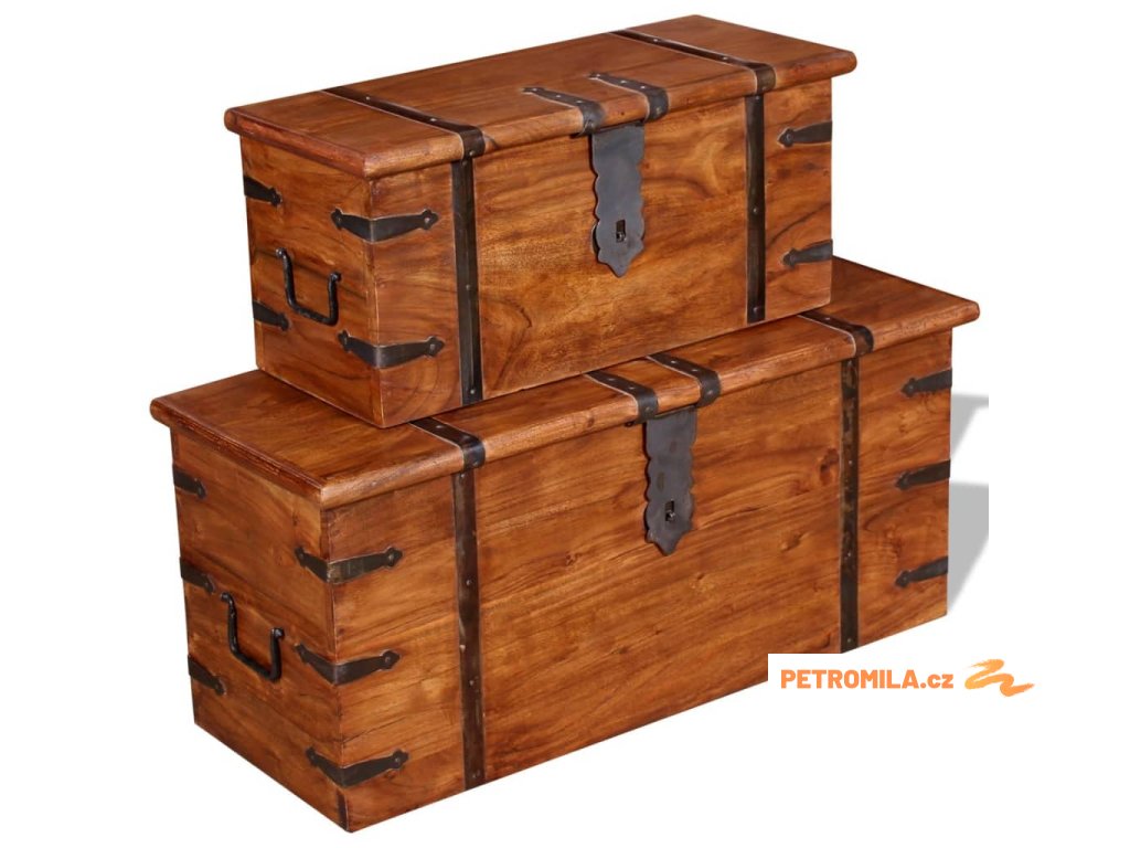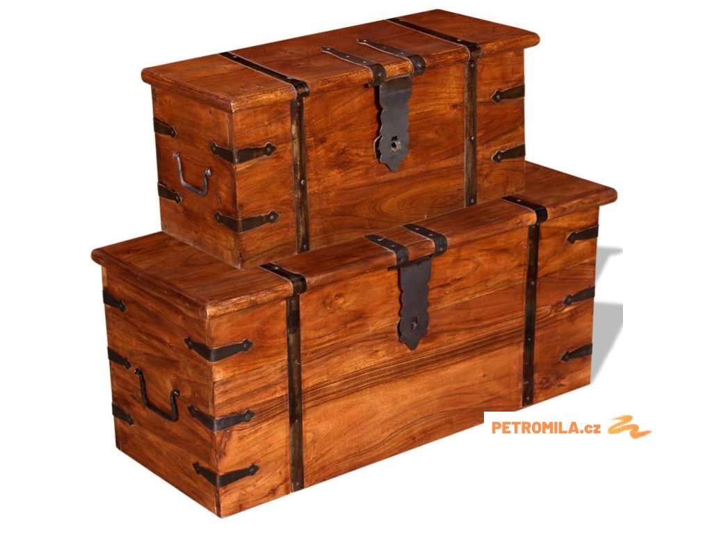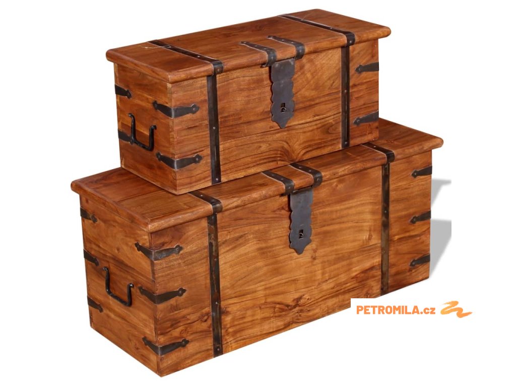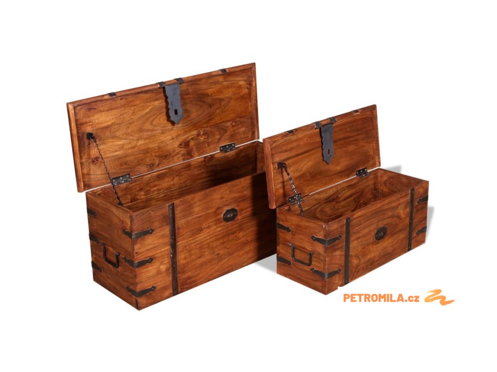 Tyto úložné boxy vnesou do vašeho bydlení dostatek úložného prostoru pro oblečení, časopisy, knihy, nářadí a další příslušenství. Na přední straně mají západku a dvě rukojeti po stranách. Jelikož mají pevnou horní desku, lze tyto dřevěné boxy použít také jako konferenční stolky, stolky ke gauči, stolky do obývacího pokoje, odkládací stolky, koncové stolky atd. Úložné truhly jsou ručně vyrobené z masivního akáciového dřeva a mají charakteristické vlastnosti palisandru a rosewood. Zručné řemeslné zpracování a krásná kresba dřeva propůjčuje každému kusu nábytku jeho jedinečný a od všech ostatních lehce odlišný vzhled.