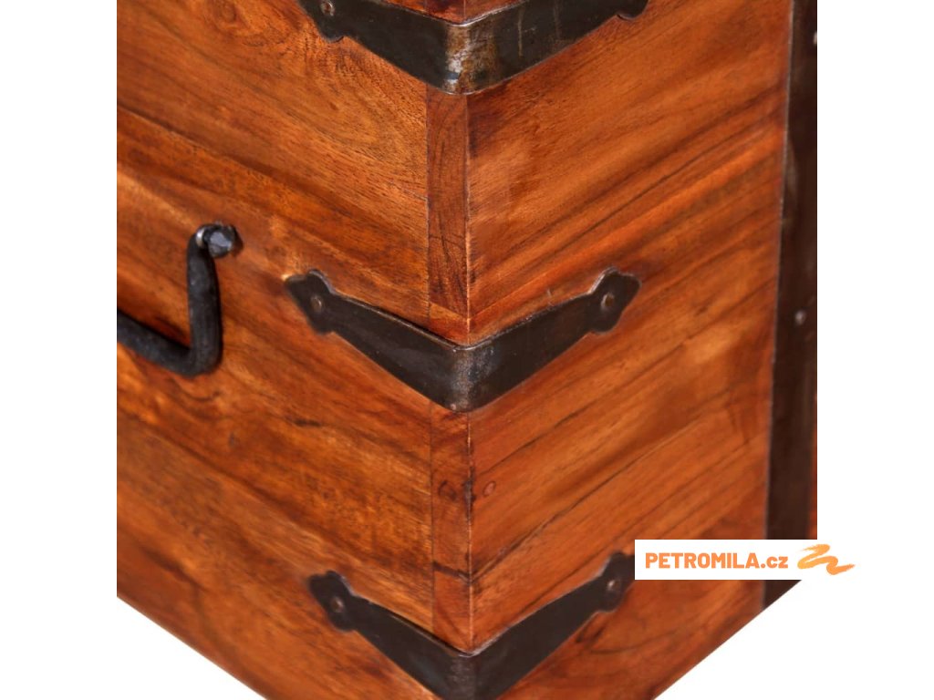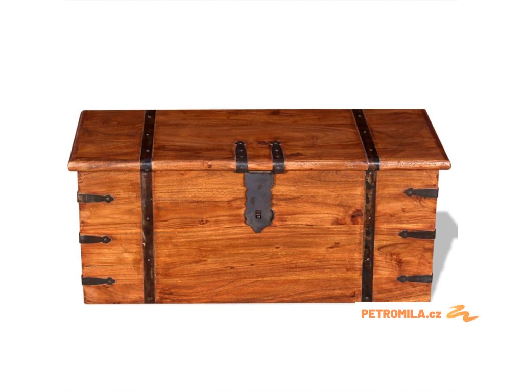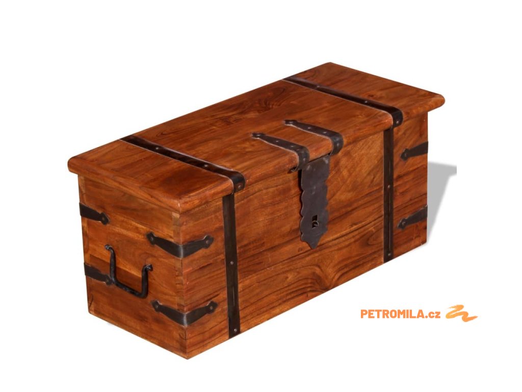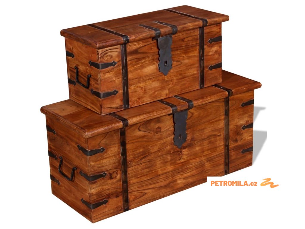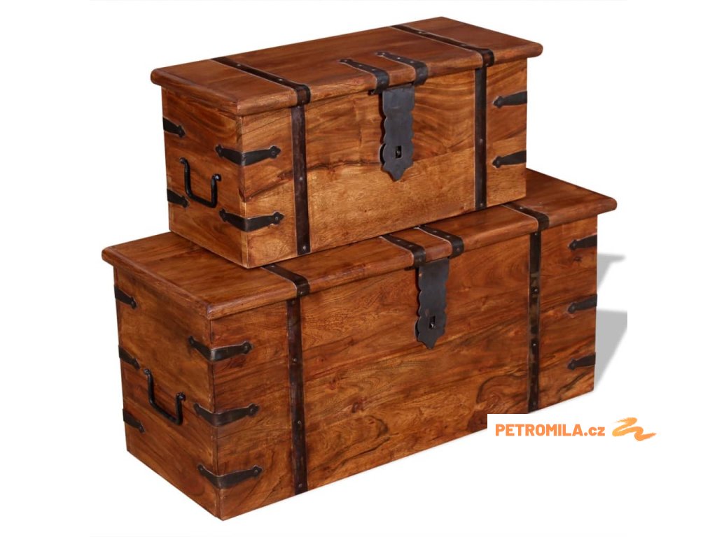 Tyto úložné boxy vnesou do vašeho bydlení dostatek úložného prostoru pro oblečení, časopisy, knihy, nářadí a další příslušenství. Na přední straně mají západku a dvě rukojeti po stranách. Jelikož mají pevnou horní desku, lze tyto dřevěné boxy použít také jako konferenční stolky, stolky ke gauči, stolky do obývacího pokoje, odkládací stolky, koncové stolky atd. Úložné truhly jsou ručně vyrobené z masivního akáciového dřeva a mají charakteristické vlastnosti palisandru a rosewood. Zručné řemeslné zpracování a krásná kresba dřeva propůjčuje každému kusu nábytku jeho jedinečný a od všech ostatních lehce odlišný vzhled.