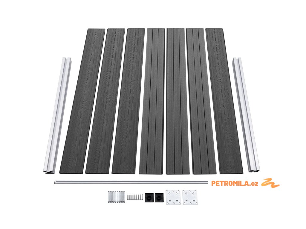 - Materiál: WPC (dřevoplast), hliník, ocel