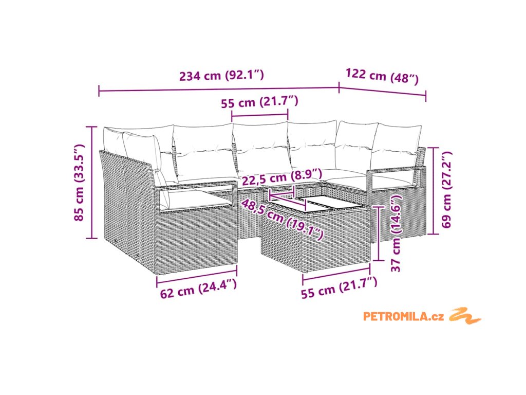 - 2 x Rohové sedadlo: 62x62x85 cm (DxŠxV)