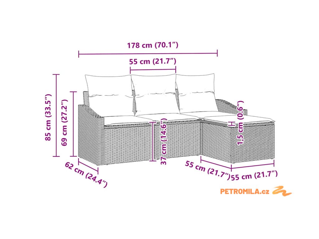 - Kompletní sezení: Obsahuje centrální sedadlo, dvě pohovky s opěrkami a taburet, které si můžete libovolně uspořádat. Rozměry pohovek jsou 123 x 62 x 85 cm a taburetu 55 x 55 x 40 cm. Díky nim se hodí jak na velké, tak na malé sezení.