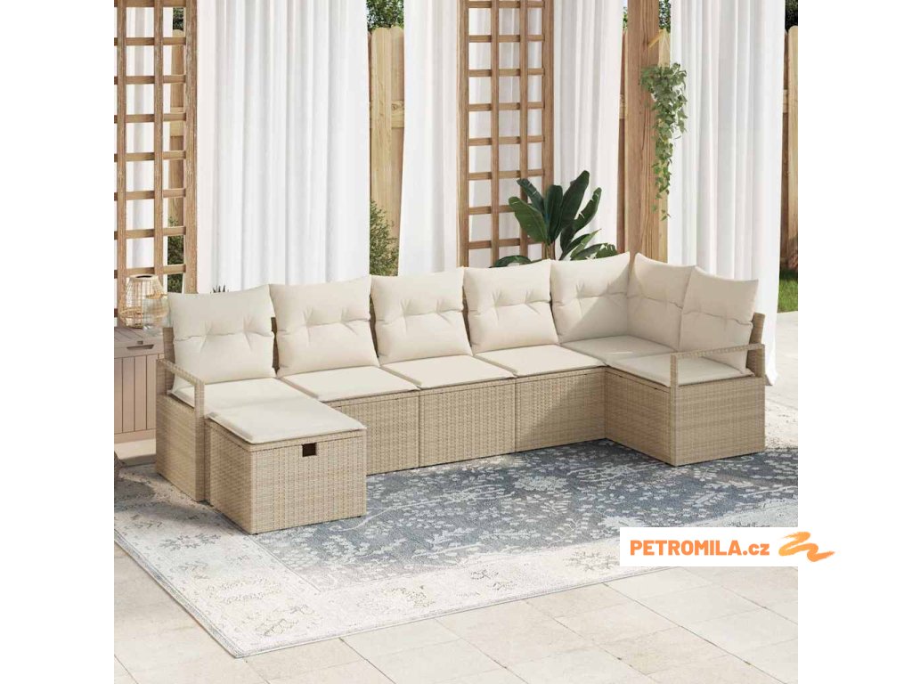 7dílný zahradní jídelní set s poduškami světle šedý polyratan