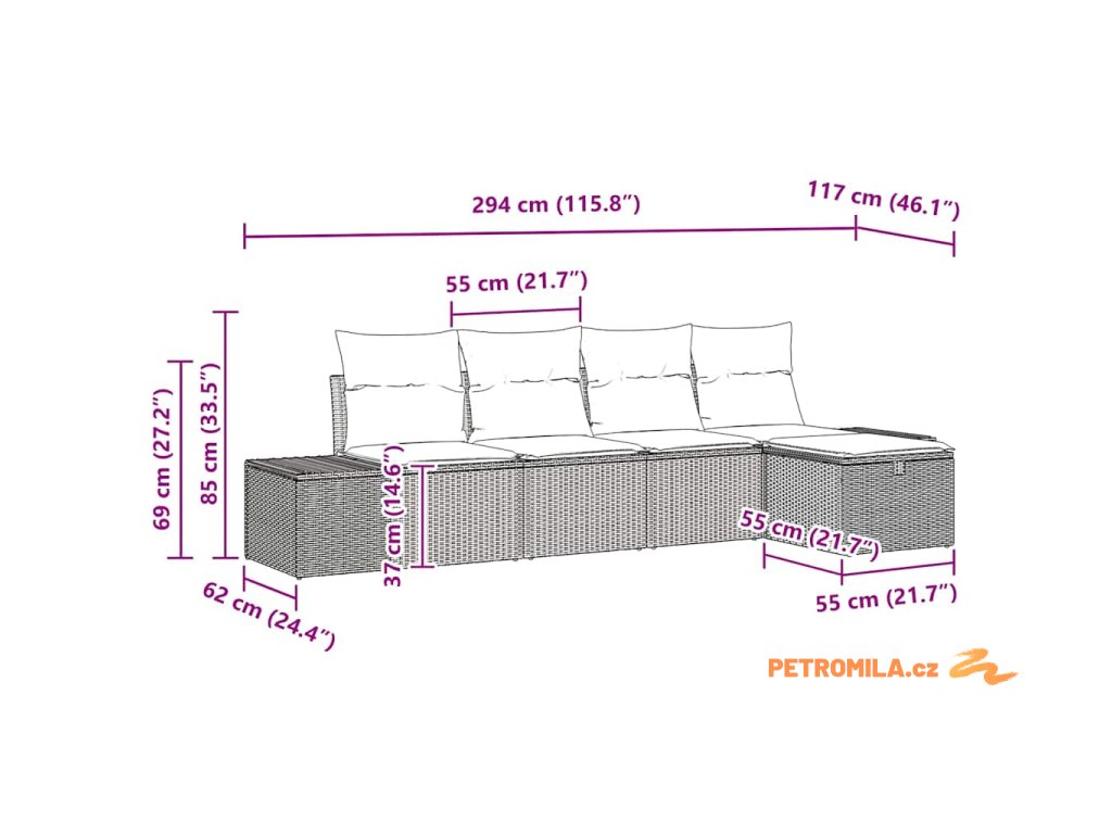 - 2 x středový sedák: 55 x 55 x 69 cm (D x Š x V)