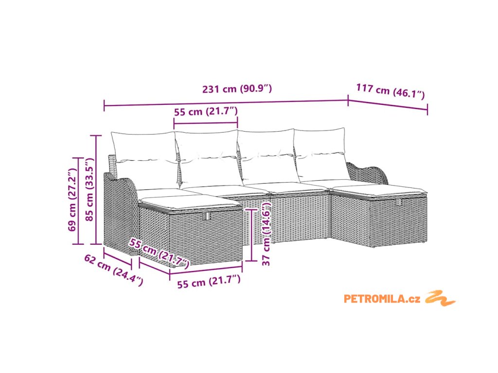 - Celkové rozměry: 231 x 117 x 85 cm (D x Š x V)