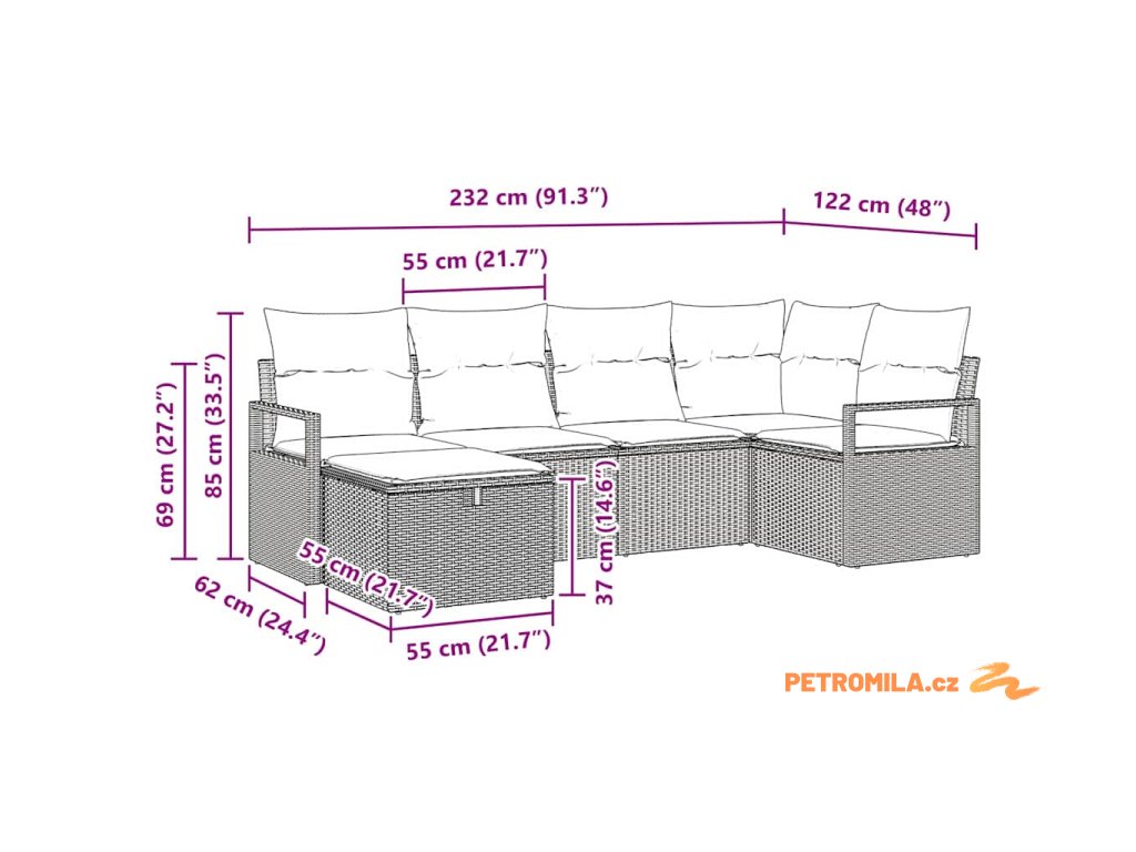- Celkové rozměry: 232 x 122 x 85 cm (D x Š x V)