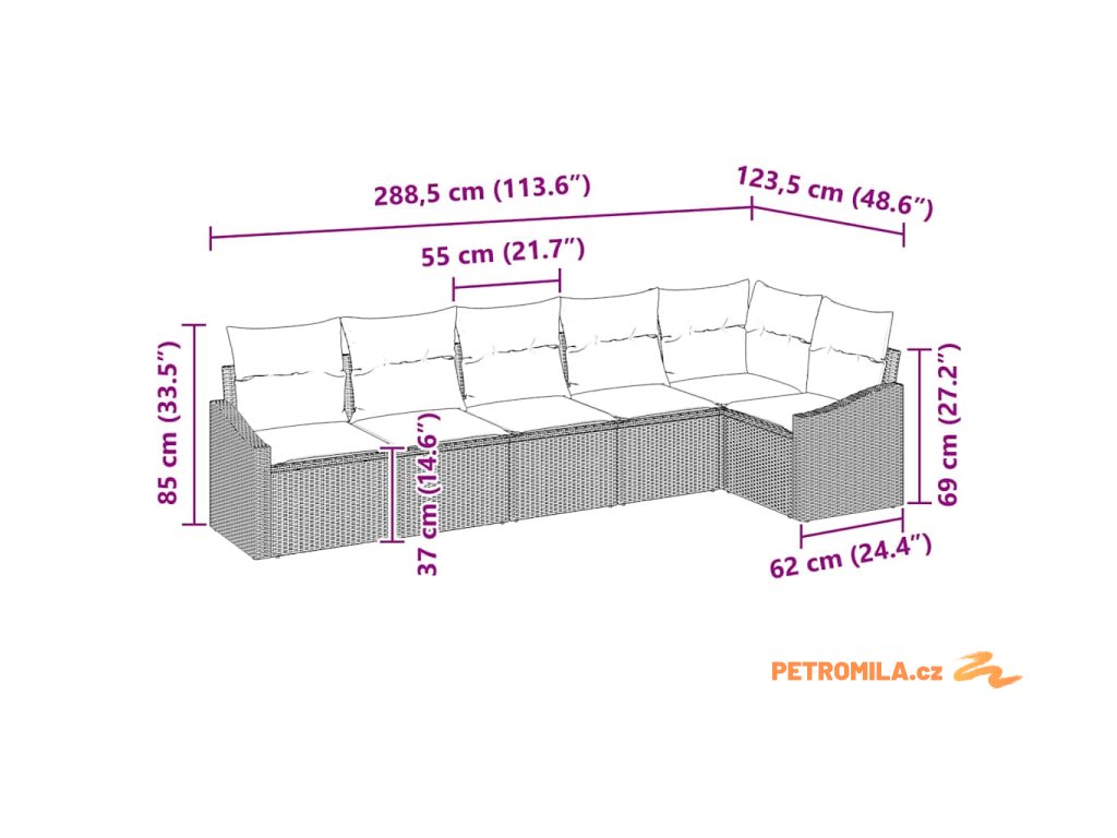 - 3 x Středové sedátko: 55×62×85 cm (Š×H×V)