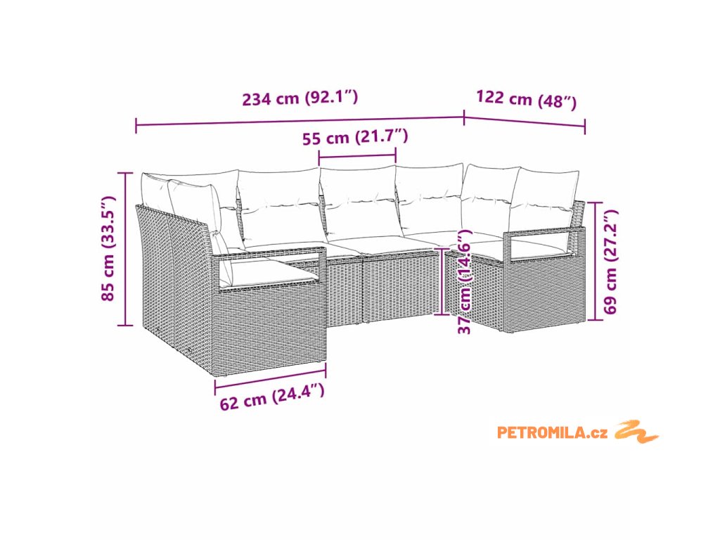 - 1 x rohový sedák: 62×62×85 cm (Š×H×V)
