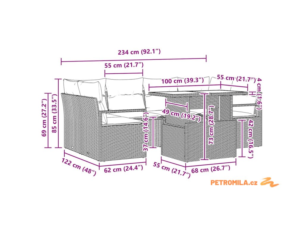 - 1 x rohové sedadlo: 62×62×85 cm (Š×H×V)