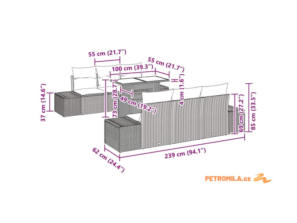 - 4 x boční pohovka: 184 x 62 x 85 cm (D x Š x V)