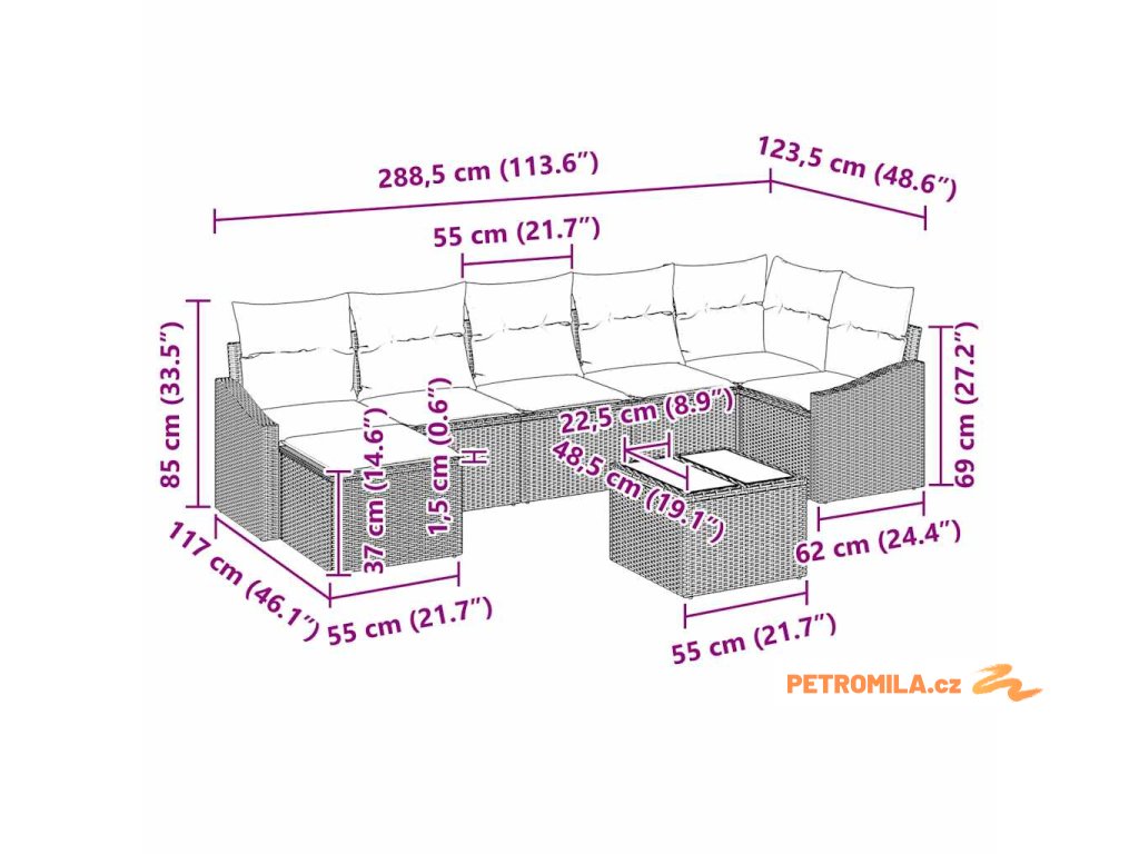 - 1 x rohové sedadlo: 62×62×85 cm (Š×H×V)