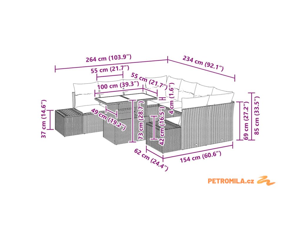- 2 x Rohové sedadlo: 62 x 55 x 85 cm (D x Š x V)