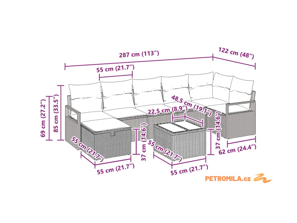 - 1 x rohové sedadlo: 62 x 62 x 85 cm (D x Š x V)