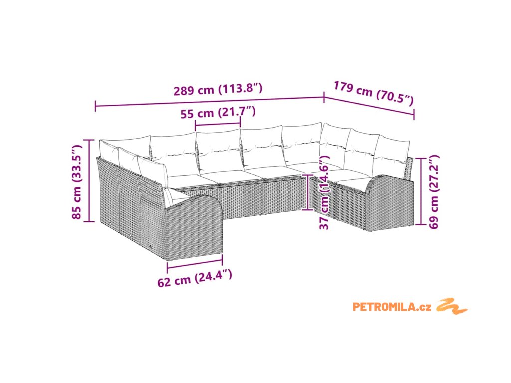 - 5 x Středové sedátko: 55 x 62 x 85 cm (ŠxHxV)