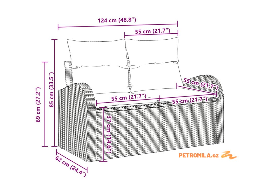 - 2 x Rukávový gauč: 124 x 62 x 85 cm (ŠxHxV)