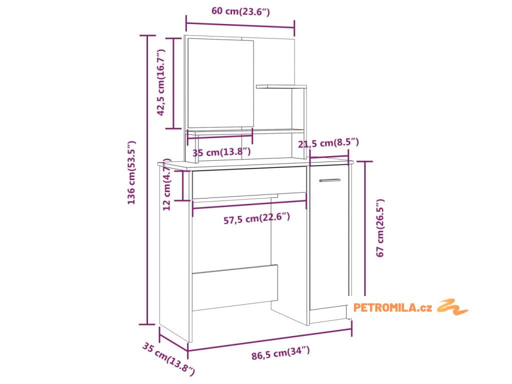 - Rozměry toaletního stolku: 86,5 x 35 x 136 cm (Š x H x V)