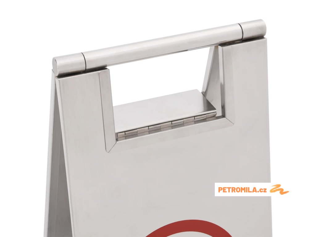 Cedule je vyrobená z nerezové oceli, která je korozivzdorná a snadno se čistí. Pasují do ní dva panely s výstrahou: z každé strany jeden. Značka má také rukojeť, aby se vám lépe přenášela. A když ji nepoužíváte, dá se složit pro jednoduché uskladnění.