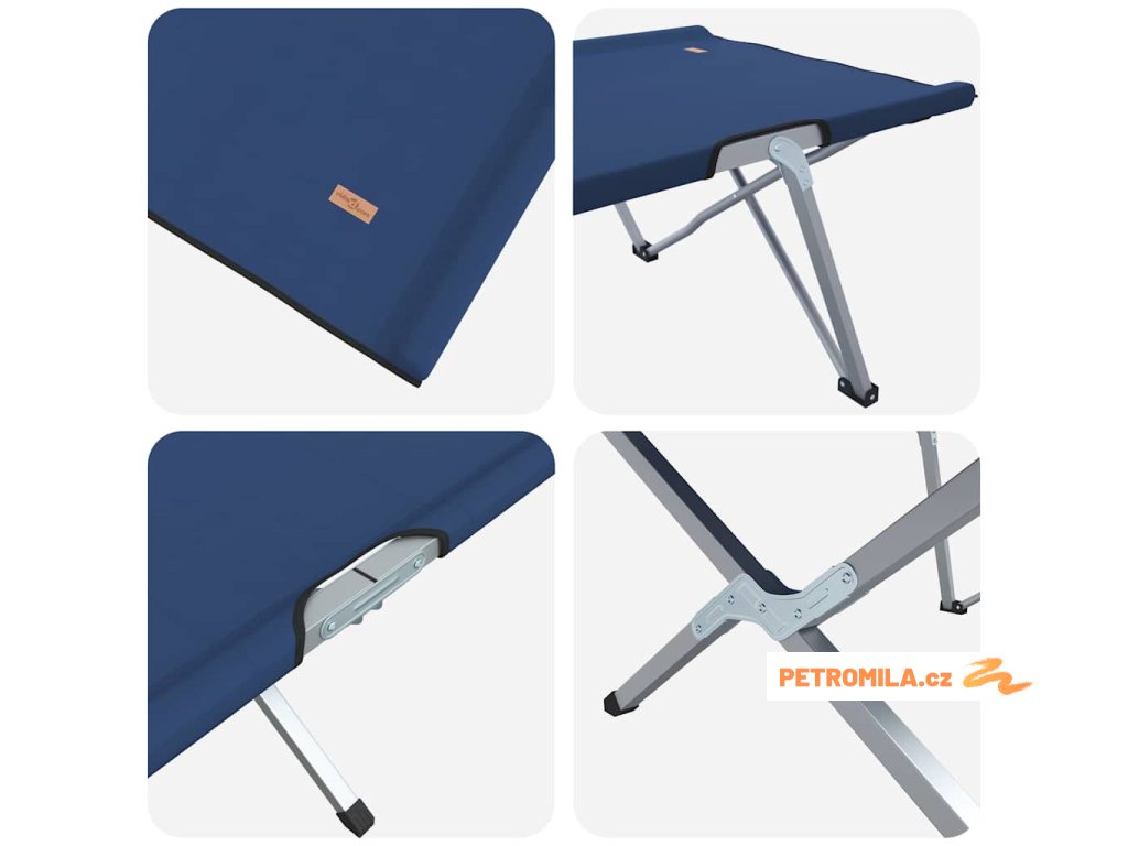 - Materiály: Postel má odolnou oxfordskou tkaninu a pevný ocelový rám. Tkanina je odolná vůči počasí a bez problémů zvládá venkovní podmínky, a ocelový rám ji udržuje stabilní a bezpečnou, což zajišťuje spolehlivou oporu na různých površích.
