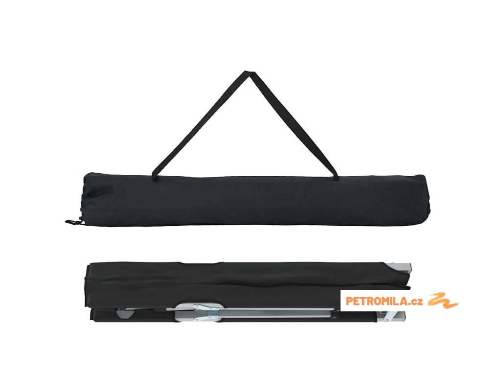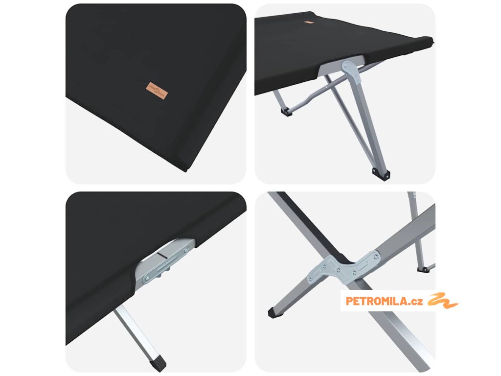 - Materiály: Postel má odolnou oxfordskou tkaninu a pevný ocelový rám. Tkanina je odolná vůči počasí a bez problémů zvládá venkovní podmínky, a ocelový rám ji udržuje stabilní a bezpečnou, což zajišťuje spolehlivou oporu na různých površích.
