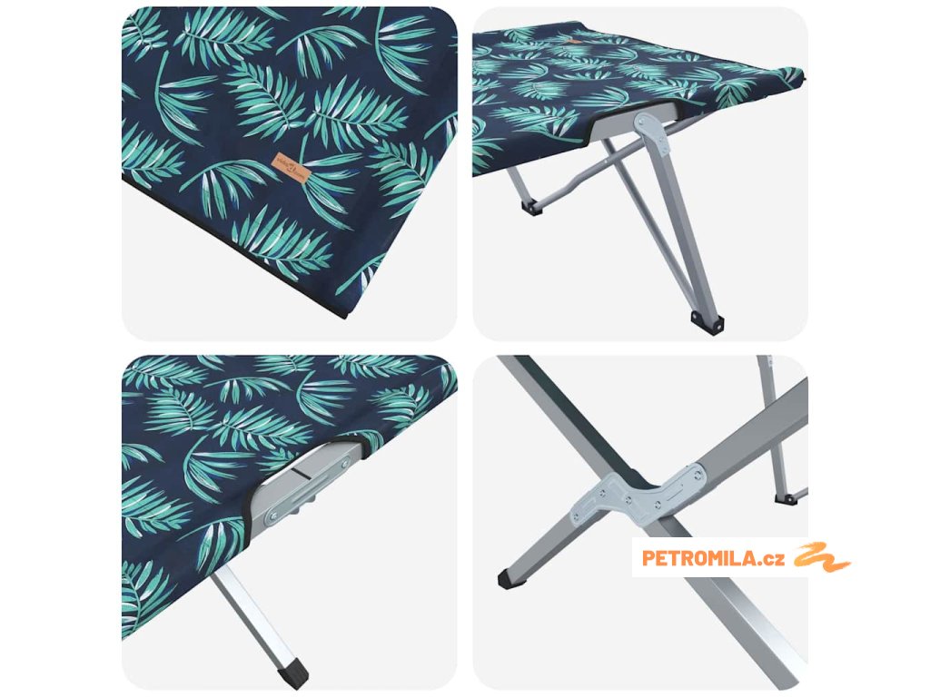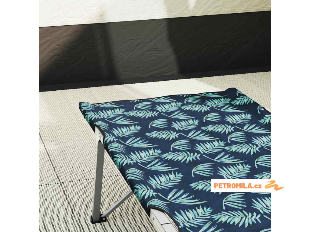 - Materiály: Postel má odolnou oxfordskou tkaninu a pevný ocelový rám. Tkanina je odolná vůči počasí a bez problémů zvládá venkovní podmínky, a ocelový rám ji udržuje stabilní a bezpečnou, což zajišťuje spolehlivou oporu na různých površích.