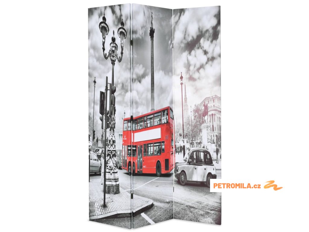 Tato dělící stěna má masivní dřevěný rám a je potažena odolným plátnem, na kterém je krásná monochromatická fotografie vyobrazující ulici v Londýně s ikonickým dvoupatrovým autobusem v kontrastní červené barvě a vašemu interiéru dodá nádech moderního stylu. Tato dělící stěna může být pro úsporu místa také jednoduše složena, když ji právě nepoužíváte.