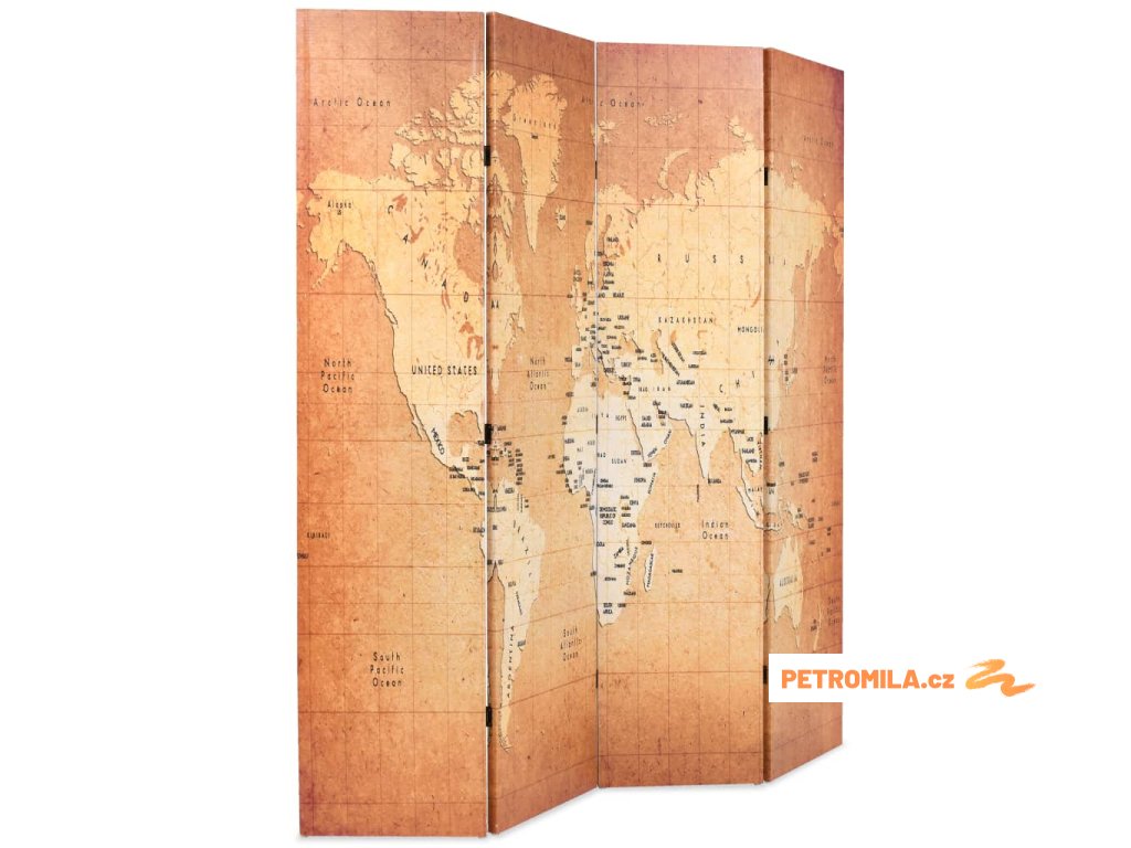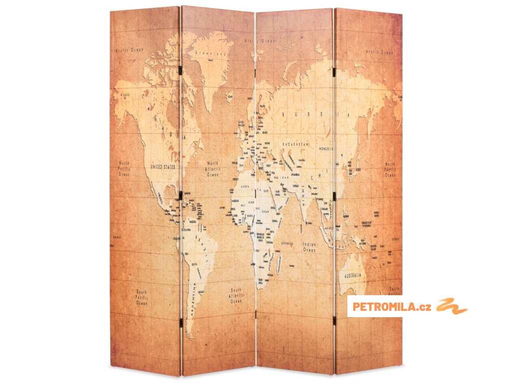 Paraván má masivní dřevěný rám a je pokrytý odolným plátnem, na kterém je natištěna mapa světa v zemitých tónech. Vašemu interiéru dodá dotek moderního šarmu. Paraván lze také snadno sklopit pro úsporné skladování, když se nepoužívá.