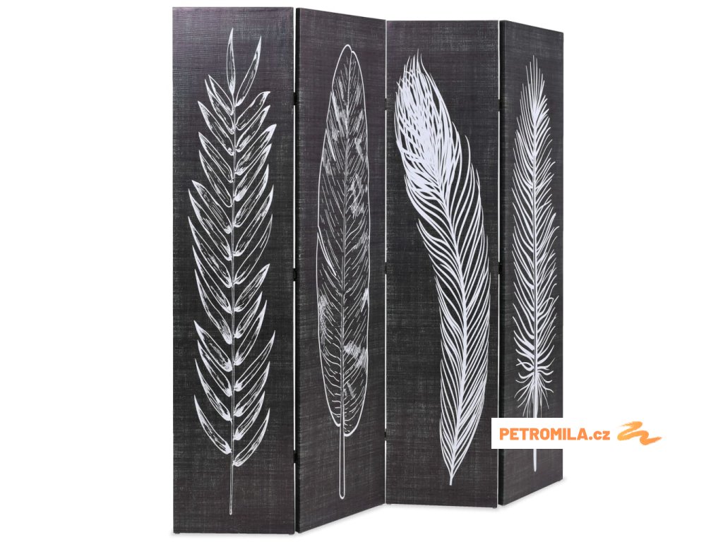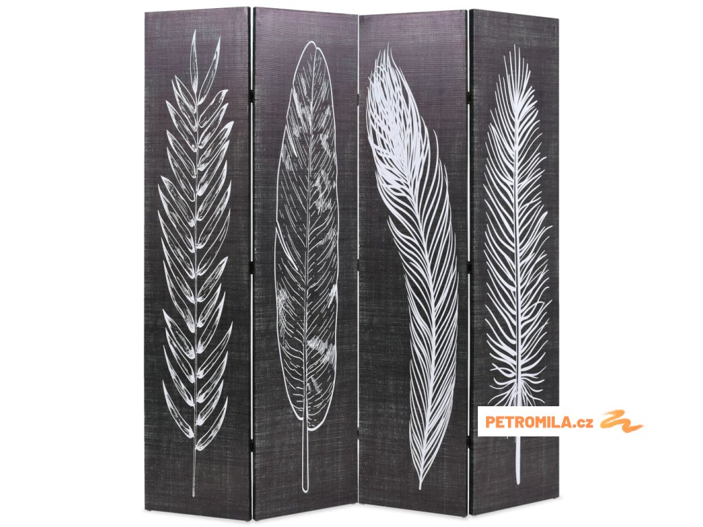 Paraván má masivní dřevěný rám a je pokryt odolným plátnem, který má na obou stranách sofistikovaný potisk na motiv pírek. Do vašeho pokoje vnese zajímavý styl a dekor. Paraván lze také snadno složit pro úsporné skladování, když ho právě nepoužíváte.