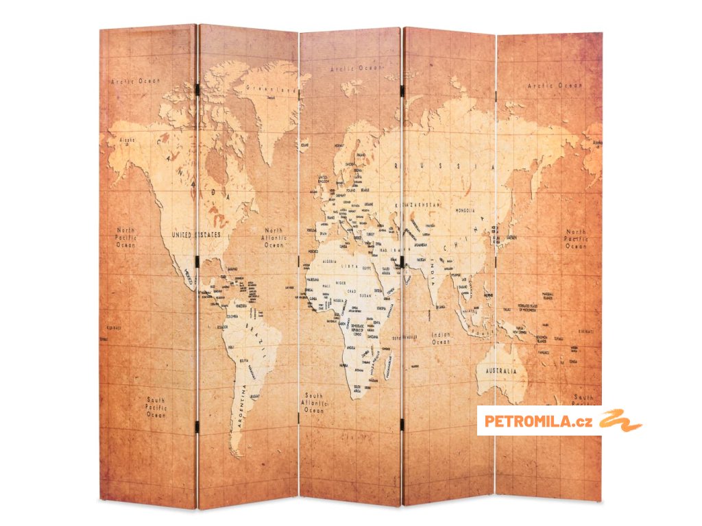 Paraván má masivní dřevěný rám a je pokrytý odolným plátnem, na kterém je natištěna mapa světa v zemitých tónech. Vašemu interiéru dodá dotek moderního šarmu. Paraván lze také snadno sklopit pro úsporné skladování, když se nepoužívá.