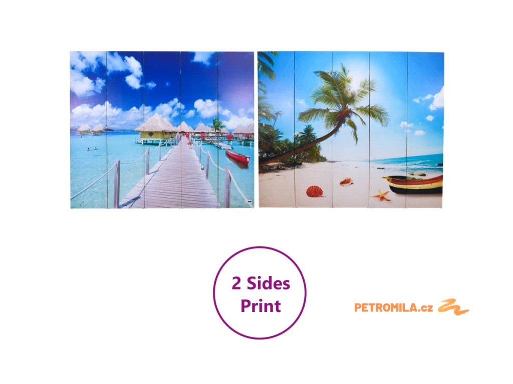 Tento paraván je na každé stranně potištěn jiným potiskem. Otočením paravánu vytvoříte v daném místě jinou atraktivní atmosféru. Prohlédněte si fotografie a podívejte se na různé potisky. Paraván je také skládací pro snadnou přepravu a skladování.