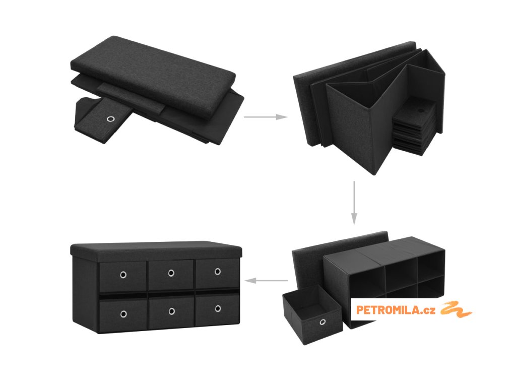 Lavice do předsíně je vyrobena z MDF a čalouněna umělým lnem, takže je odolná a stabilní. Tento pěnou polstrovaný úložný box je pohodlný na sezení a 6 zásuvek nabízí dostatek úložného prostoru pro uschování mnoha různých předmětů na dosah ruky. Navíc se dá i složit, takže ušetříte místo, když se nepoužívá.