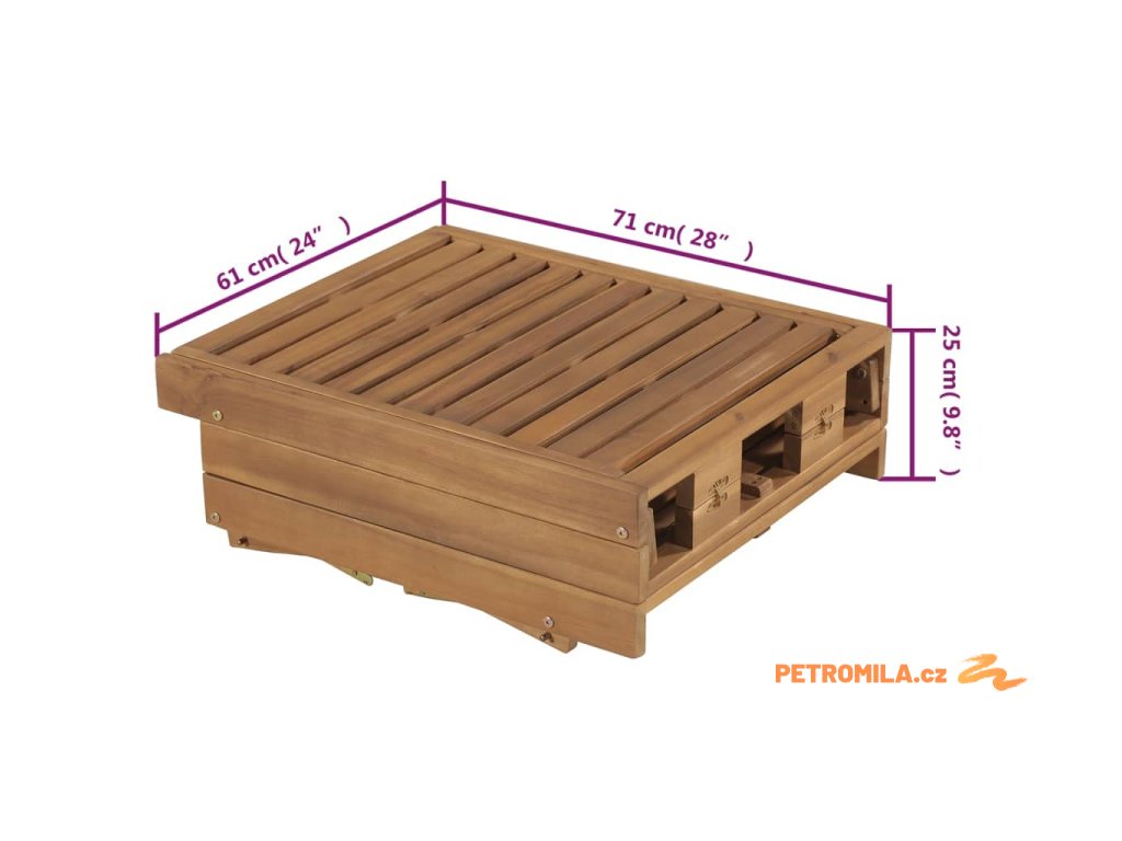 - Rozměry zahradního lehátka (při složení): 71 x 61 x 25 cm (D x Š x V)