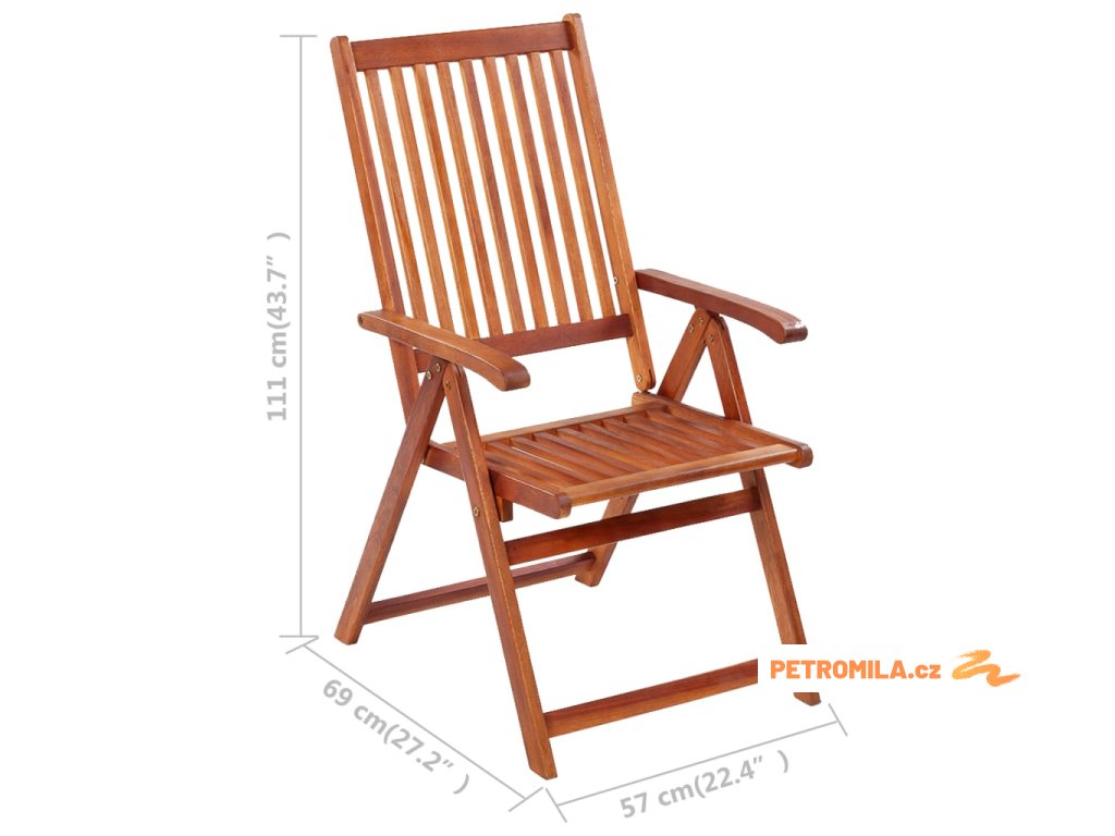 Skládací židle je vyrobená z masivní akácie, což je tropické tvrdé dřevo, které je stabilní a velmi odolné. Povrch je napuštěný olejem, takže se snadno čistí vlhkým hadříkem. Jídelní židle se dá polohovat do 5 pozic, poskytne vám tedy při sezení optimální pohodlí. Židli můžete složit, abyste ušetřili místo, když ji zrovna nepoužíváte. O komfort se vám při relaxaci a odpočinku postarají dodané podušky, které lze na obou stranách upevnit párem šňůrek a elastickým popruhem na opěradlo.